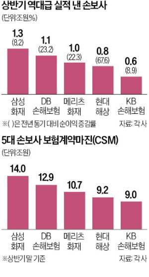 가이드라인 적용 시 보험사의 CSM은 대폭 줄어든다. 특히 해지율을 낙관적으로 적용한 회사일수록 타격이 크다. 삼성화재 DB손해보험 메리츠화재 현대해상 KB손해보험 등 5대 손보사 가운데 일부 회사는 CSM이 1조원 이상 감소하는 것으로 알려졌다. 반면 5대 손보사 중 CSM 감소액이 1000억원대에 그치는 곳도 있었다. 보험업계 관계자는 “무·저해지 보험을 많이 판매한 회사라도 해지율 가정을 보수적으로 했다면 CSM 감소액이 적다”고 말했다.