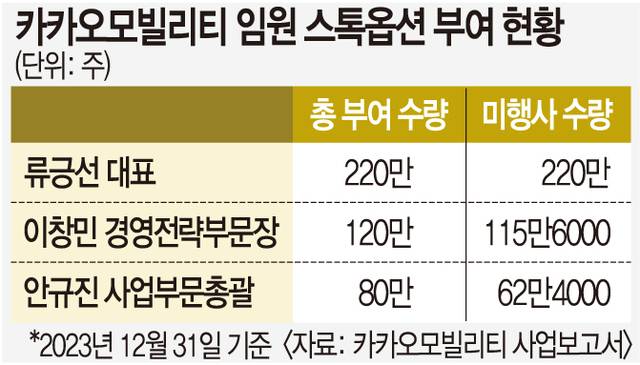 카카오모빌리티 관계자는 “안 CBO가 최초 부여받은 스톡옵션 17만6000주는 행사 시기가 도래하면서 오래전에 행사한 것”이라며 “추가로 부여받은 스톡옵션은 여전히 보유 중인 데다 회사 성장 비전에 대한 믿음을 기반으로 개인이 별도로 주식을 매입하기도 했다”고 말했다.