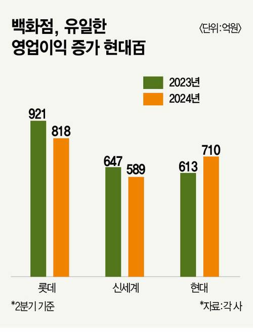백화점 빅3 중 매출과 영업이익이 모두 늘어난 건 현대백화점이 유일하다. 롯데백화점의 올해 2분기 매출은 8361억원으로 0.7% 늘었지만 영업이익이 589억원으로 전년(647억원)보다 9% 감소했다. 신세계백화점도 비슷한 상황이다. 매출액이 6417억원으로 2.1% 늘었지만 영업이익은 818억원으로 전년(921억원) 대비 11% 넘게 빠졌다.