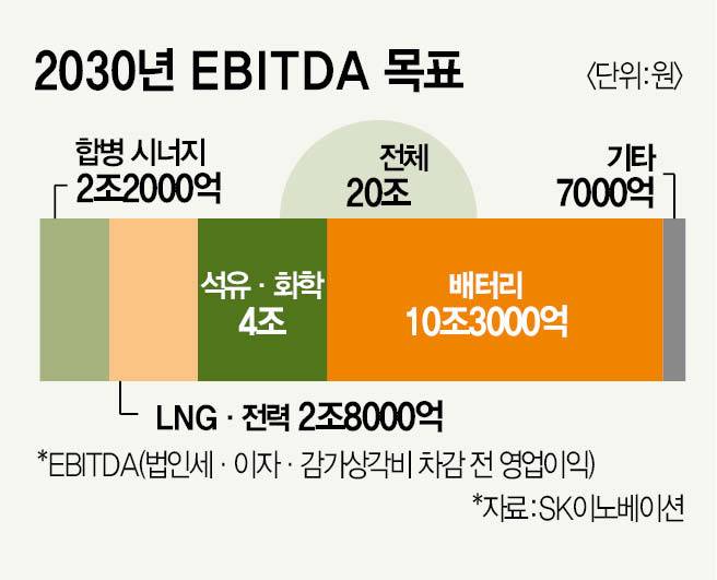 SK이노베이션은 통합 시너지만으로 2030년 2조원 이상 EBITDA를 만들겠다는 목표다. ▲석유개발(E&P)·트레이딩 경쟁력 강화(1000억원) ▲액화천연가스(LNG) 판매·구매와 마케팅 강화(4000억원) ▲제품·서비스 패키지화(1조6000억원) ▲글로벌 역량 결집(1000억원) 등을 방안으로 제시했다. 이를 통해 2030년 20조원 이상 EBITDA 창출이 목표다. 윤재성 하나증권 애널리스트는 “이번 합병으로 SK이노베이션 현금흐름이 강화돼 재무 리스크가 상당 부분 완화됐다”면서도 “SK온의 조속한 정상화가 결국 추세 전환의 핵심”이라고 말했다.