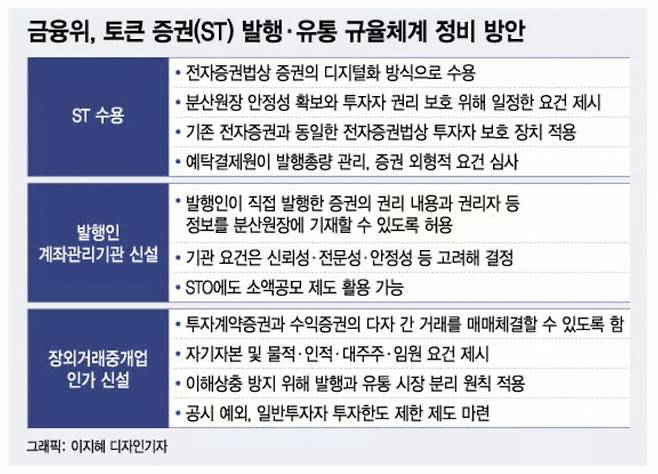 전자증권법 개정안은 STO(토큰증권 발행)에 활용되는 핵심 기술인 분산원장 정의와 규율 근거를 신설하고, 발행인 계좌관리기관 등록제를 신설하는 내용이다. 자본시장법 개정안에는 투자계약증권 유통 규율 근거와 토큰증권 거래를 위한 장외거래중개업자 인가를 만드는 조항을 담았다.