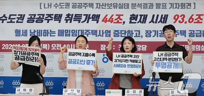 5일 서울 종로구 경제정의실천시민연합 강당에서 열린 LH 수도권 공공주택 자산보유실태 분석결과 발표 기자회견에서 경실련 관계자들이 공공주택 자산내역, 분양원가 등 행정정보 투명 공개를 촉구하고 있다.