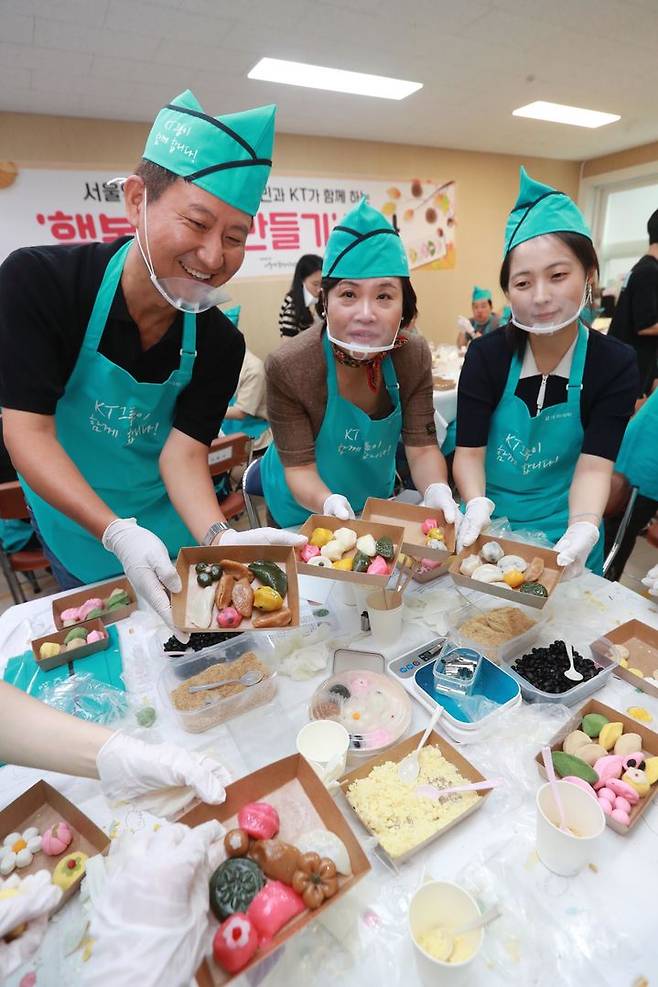 KT임직원들이 쪽방촌 주민들과 함께 송편을 빚어 나누는 행사를 진행하고 있다. (사진=KT 제공) 2024.09.05. photo@newsis.com *재판매 및 DB 금지