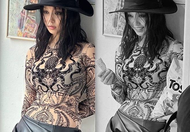 공개된 사진 속 고민시는 화려한 무늬의 누드톤 시스루 드레스를 입고, 가죽 하의를 매치해 시크한 매력을 드러냈다.