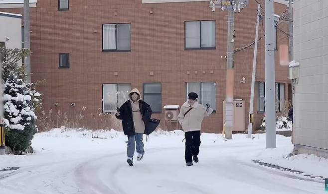 두 사람은 눈 내리는 길을 걸으며 서로의 사진을 찍어주었다. 정국은 "눈 보이냐. 기가 막힌다"라며 아름다운 설경에 감탄했다. 감성을 한껏 끌어올리던 두 사람은 점점 더 내리는 폭설에 당황하기 시작했다. 두 사람은 "눈이 옷 안으로도 들어간다. 좋긴 좋은데, 얼어붙을 것 같다"라고 말해 웃음을 자아냈다. 그러면서도 두 사람은 눈싸움을 하며 겨울을 즐겼다.
