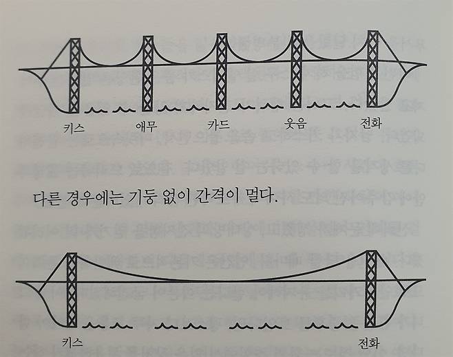 사랑의 영속성 시나리오는 현수교에 비유할 수도 있다. 다섯 기둥은 사랑의 확인을 상징하고, 냉담한 기간은 기둥 사이에 몇 미터씩 늘어진 케이블이다. 머리에 하는 키스, 애정 어린 눈길은 다릿기둥이고, 말 없는 식사, 응답 없는 전화는 기둥 사이의 케이블이다. (중략) 두 사람 다 따뜻하고 마음이 열려 있거나 그저 서로가 필요한 경우, 기둥이 촘촘이 박히게 되고, 애정의 신호가 지속되면서 기둥 사이의 케이블이 거의 늘어나지 않는다.