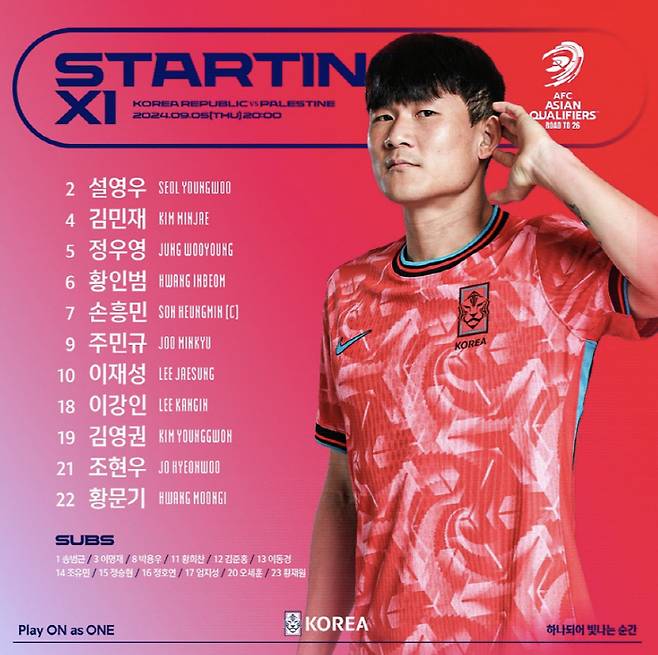 홍 감독은 베스트 라인업으로 첫 경기에 나섰다. 유럽파 3대장이 모두 나섰다. 주민규(울산)이 최전방에 서고, 손흥민 이재성(마인츠) 이강인이 2선에 자리했다. 중원에는 페예노르트 이적을 확정지은 황인범과 정우영(울산)이 포진했다. 포백은 설영우(즈베즈다)-김영권(울산)-김민재-황문기(강원)가 이뤘다. 황문기는 이번이 A매치 데뷔전이다. 골문은 조현우(울산)가 지켰다. 황희찬(울버햄턴) 엄지성(스완지시티) 오세훈(마치다) 등은 벤치에서 출발했다. 양민혁 최우진 이한범은 엔트리에서 제외됐다.