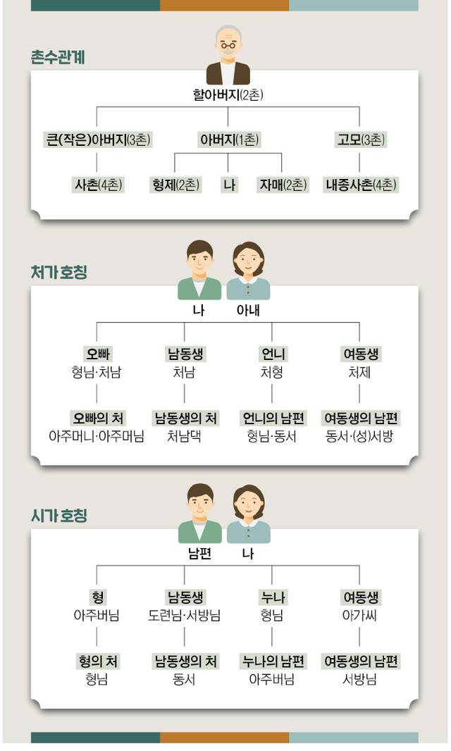 김형배 국립국어원 학예연구원은 “친척간 호칭은 지역이나 가풍 등에 따라 다를 수 있다”며 “전통만을 고집해 갈등을 빚기보단 상황에 맞게 서로 배려하는 호칭을 쓰는 게 중요하다”고 조언했다.