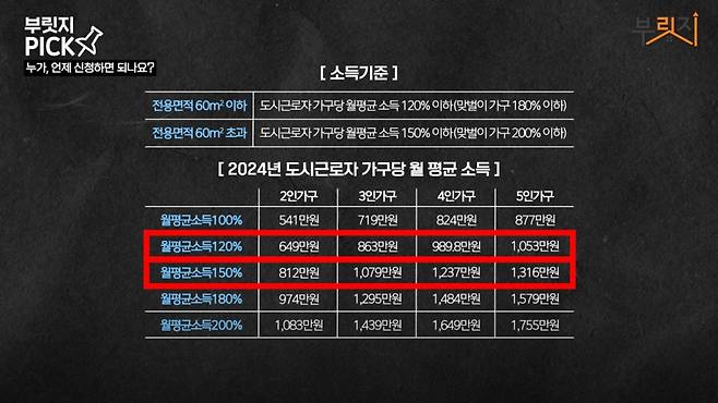 소득기준은 굉장히 완화됐습니다. 전용면적 60㎡ 이하는 가구당 월평균 소득 120% 이내, 60㎡ 초과는 150% 이내면 신청할 수 있습니다. 맞벌이 가구라면 기준이 더 낮아지고요. 태아도 가구원수에 포함되기 때문에 뱃속에 아이가 있는 부부는 3인 가구 소득기준이 적용됩니다.