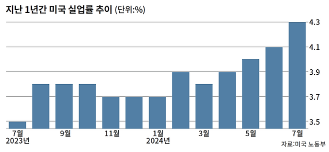 두 번째 불씨는 8월2일 발표된 미국의 7월 고용지표다. 미국의 7월 실업률은 6월(4.1%)보다 0.2%포인트 오른 4.3%로 나타났다. 전문가들의 예상치(4.1%)보다 높았다. 7월에 미국 경제가 창출한 일자리(농업 부문 제외)는 11만4000개로 ‘이전 12개월 평균(21만5000개)’의 절반에 머물렀다. 전문가 전망치(18만5000개)보다 적었다.