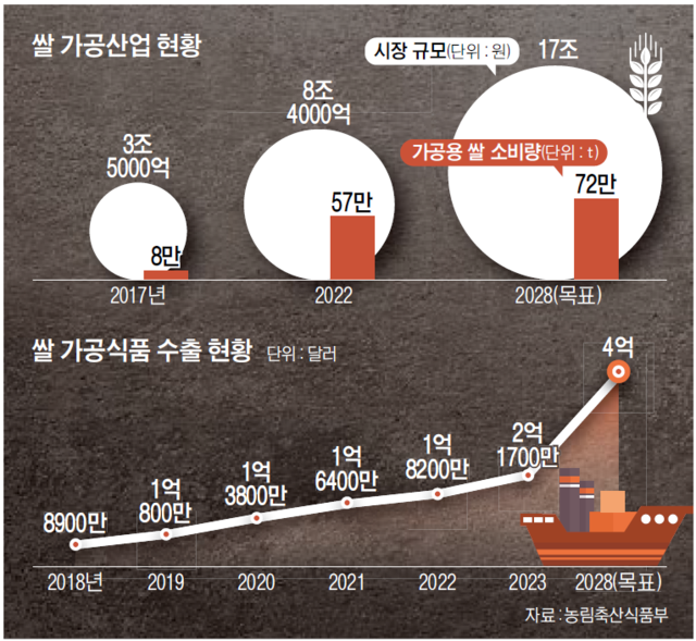 정부는 여세를 몰아 2028년까지 쌀 가공식품 수출액 4억달러를 달성하겠다는 목표를 세웠다. 농림축산식품부와 한국쌀가공식품협회가 6월 개최한 ‘2024 쌀 가공식품 산업대전’에서 705억원 규모의 수출 상담 실적을 기록하는 등 당분간 해외 판로 개척에 훈풍이 불 것이란 전망이 나온다.