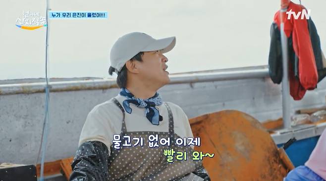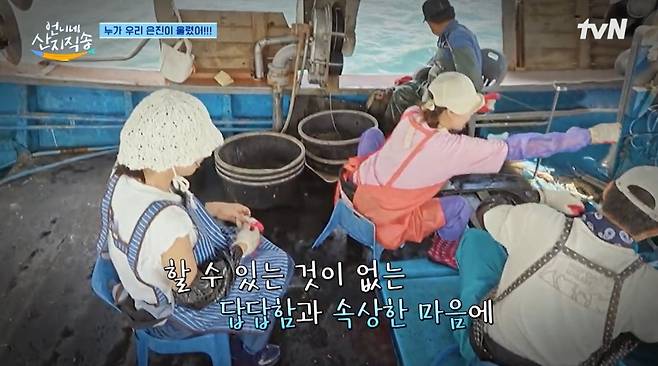 안은진은 "너무 속상하다. 열심히 일하고 싶은데 바다 나갔을 땐 전혀 도움이 되지 못하는 그런 사람이다"라며 속상해했다. 염정아와 차태현은 그런 안은진을 다독여줬다. 안은진이 민망해하지 않도록 차태현은 "보지 마라. 계속 팔딱거린다"고 말했다. 염정아는 열심히 조업에 참여했다. 천직을 찾은 듯한 염정아의 능숙한 모습에 차태현은 "여기 집 하나 하셔야겠다"라고 추천해 웃음을 자아냈다. 안은진도 "언니 너무 잘한다"며 감탄했다.