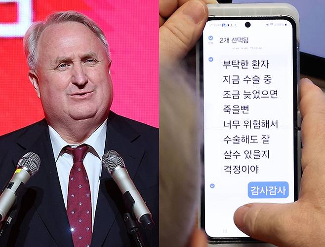 인요한 최고위원은 이날 오전 국회 본회의에서 열린 추경호 원내대표의 교섭단체 대표 연설 중 휴대폰 문자메시지를 확인했다. 인 최고위원은 해당 메시지엔 “부탁한 환자 지금 수술 중. 조금 늦었으면 죽을 뻔. 너무 위험해서 수술해도 잘 살 수 있을지 걱정이야”라고 문자메시지를 보냈고, 인 최고위원은 여기에 “감사감사”라고 답장을 보냈다.
