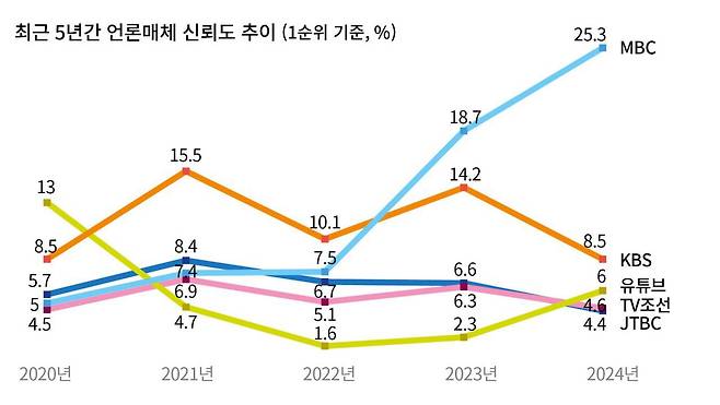 ‘가장 신뢰하는 언론 매체(1순위 기준)’로는 MBC(25.3%)를 가장 많이 꼽았다. 그 다음으로 KBS(8.5%), 유튜브(6.0%), TV조선(4.6%), JTBC(4.4%), SBS(4.1%), YTN(3.4%), 조선일보(3.3%), 한겨레(1.9%), 동아일보(1.2%) 등의 순으로 나타났다.