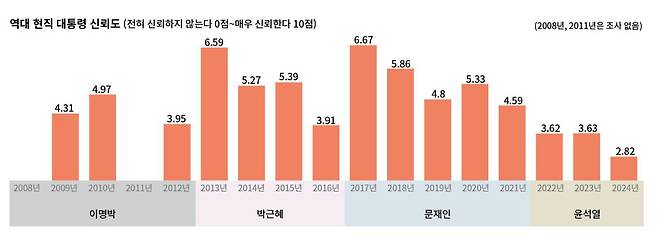윤석열 대통령의 신뢰도는 2022년 3.62점으로 이미 역대 현직 대통령 신뢰도 최저치를 기록한 데 이어 2023년 3.63점으로 소폭 올랐으나 2024년 2.82점으로 또 한 번 최저치를 갱신했다. 윤석열 대통령은 박근혜 전 대통령 임기 말 신뢰도(3.91점)를 집권 3년 차가 되도록 한 번도 넘어서지 못했다.