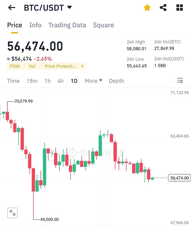 지난 26일 6만4481까지 올랐던 비트코인은 2주일만에 12.41% 하락하며 5만6000달러선으로 내려앉았다.