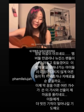 이후 지난 5월에도 "어른들의 복잡한 이야기들속에 그냥 준비해도 힘들었을 아이돌로써의 앨범준비가. 이번에 얼마나 이 어린 친구들이 힘들었을까요"라는 글과 함께 후배 아이돌 뉴진스의 신보 사진을 게재했다.