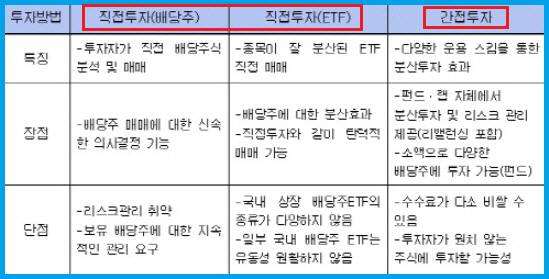 배당주에 대한 투자방식은 고배당주, 우선주, 배당성장주 등을 직접 찾아서 투자하는 ‘직접투자 방식’과 배당주 펀드에 가입하거나 ETF를 매입하는 형태 등의 ‘간접투자 방식’이 있다. 우선 직접투자는 배당수익률, 배당성향 등을 확인해서 직접 고 배당주를 골라 투자하는 방식인데 쉽지가 않다. 배당수익률은 현재의 주가대비 배당금의 비율인데 주가변동에 따라 수익률 변동이 생긴다. 배당수익률을 계산할 때 배당금은 미래 예상치를 적용하기도 한다. ‘배당성향’이란 기업이 1년 동안 벌어들인 순이익 대비 배당액의 비중을 말한다.