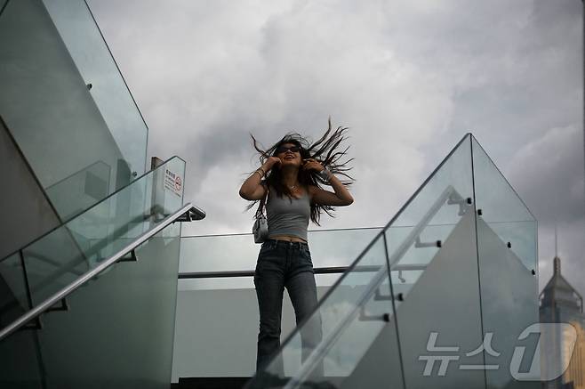 (홍콩 AFP=뉴스1) 유수연 기자 = 태풍 야기가 남중국해를 가로질러 중국 남부 해안을 향해 5일 북상하고 있다. 사진은 한 여성의 머리카락이 강풍에 날리는 모습. 2024.09.05