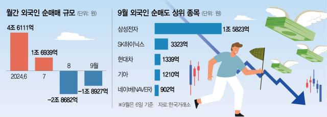 외국인 자본이 빠른 속도로 한국 증시를 이탈하고 있다. 증시가 3.65% 급락한 8월 2일 이후 한 달 남짓 동안 빠진 자금만 약 5조 원에 이른다. 미국 경기 침체 논란 속에 엔캐리 트레이드(금리가 낮은 엔화를 빌려 다른 투자자산에 투자) 청산, 엔비디아의 급락이 국내 반도체주에 여파를 끼치면서 외국인 매도세가 강해졌기 때문이다.