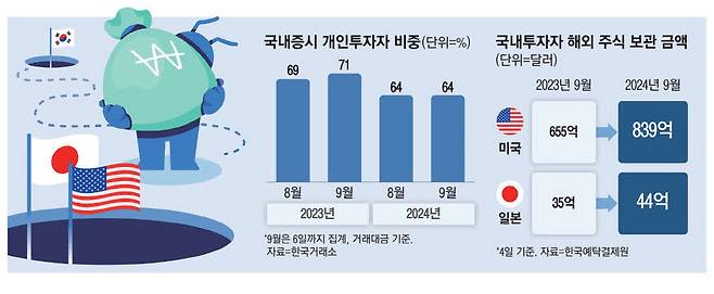 한국거래소에 따르면 9월 들어 6일까지 국내 증시 거래대금에서 개인 투자자가 차지한 비중은 64.37%로 지난해의 71.05%보다 6.68%포인트 축소됐다.