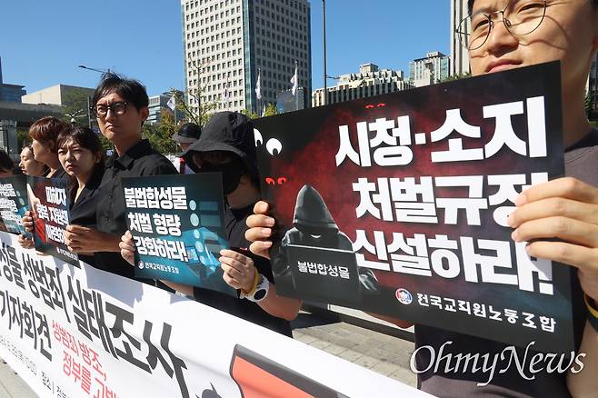 | ▲ 전국교직원노동조합 전희영 위원장과 교사들이 지난 8월 29일 오전 서울 종로구 정부서울청사 앞에서 학교 불법합성물(딥페이크) 성범죄 실태조사 결과 발표 기자회견을 열어 “2,500여명의 교사와 학생들이 설문에 참가했다. 62%나 되는 교사와 학생들이 (딥페이크)성범죄 피해에 대해 적절한 수사와 합당한 사법 절차가 이뤄지지 않고 있다”며 철저한 수사와 강력한 처벌, 피해자 지원을 위한 대책 마련을 촉구했다. |