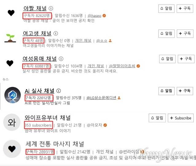 | ▲ 디지털성범죄가 발견된 아카라이브 내 비공개 채널과 구독자 수. 겉으론 "음란물 공유 금지"를 표방하지만 실상을 그렇지 않았다. |