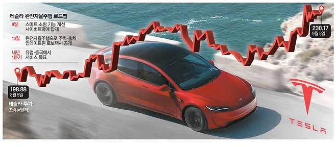 이같이 FSD와 로보택시에 대한 기대감이 반영되면서 테슬라 주가는 지난달 29일 206.28달러에서 5일에는 230.17달러까지 단기간에 11% 급등했다.