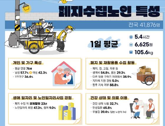 노동환경으로 바라본다면 어떨까. 100킬로에 달하는 폐지를 수집하다, 한 해 평균 6명의 노인이 차에 치여 사망한다. 하루 평균 11시간 20분을 일하며, 12.3킬로미터를 걸어, 월 10만원을 번다. 폐지 수집 어르신이 다치는 직업적 손상 유병률은 일반 인구의 10.4배, 육체 노동자와 비교해도 4.6배 더 높다.