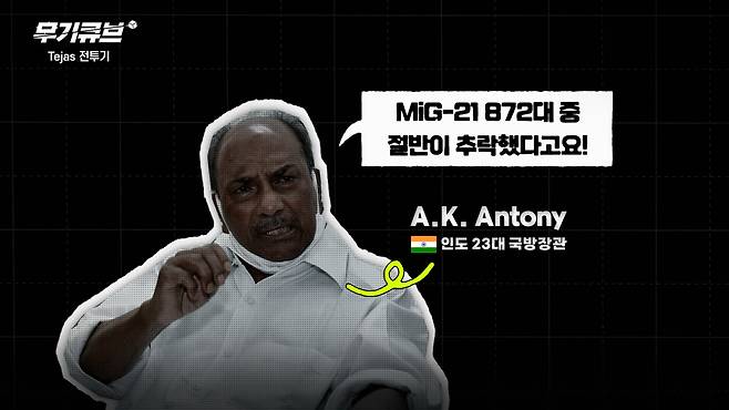 이런 MiG-21에 대해 2012년 당시 인도 국방부 장관이었던 AK 안토니는 의회에 출석해 인도의 MiG-21 872대 중 절반 이상이 지난 40년 동안 추락으로 손실됐다고 말한 바 있습니다.
