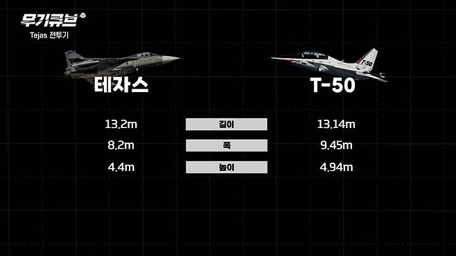 우선 크기부터 유사합니다. 테자스는 길이 13.2m, 폭 8.2m, 높이 4.4m이고 T-50은 길이 13.14m, 폭 9.45m, 높이 4.94m입니다.