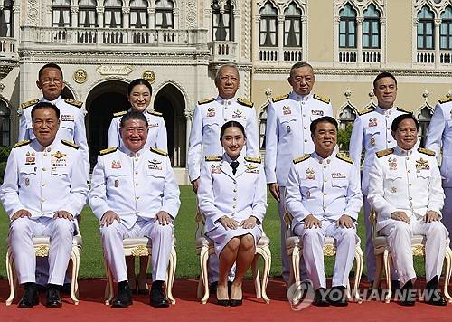 epa11590630 The new Thai Prime Minister Paetongtarn Shinawatra (C) poses for a group photo with members of her cabinet before a newly appointed cabinet special meeting at Government House in Bangkok, Thailand, 07 September 2024. Thailand's new coalition cabinet of government led by Paetongtarn Shinawatra, the youngest daughter of ousted former premier Thaksin Shinawatra, held a cabinet special meeting to prepare policy statement to parliament after it was officially endorsed and sworn in by the King on 04 September 2024. EPA/NARONG SANGNAK