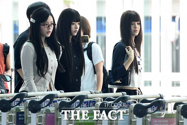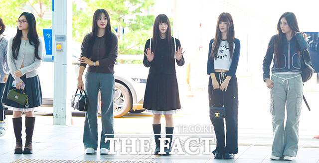그룹 뉴진스의 하니와 민지, 해린, 다니엘, 혜인(왼쪽부터)이 7일 오후 '2024 더팩트 뮤직 어워즈(TMA)' 참석차 인천국제공항을 통해 일본 오사카로 출국하고 있다.