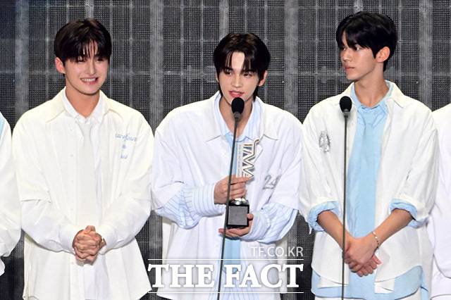 <더팩트> 가 주최하고 팬앤스타와 필링바이브(FEELINGVIVE)가 주관하는 '2024 더팩트 뮤직 어워즈(2024 THE FACT MUSIC AWARDS, TMA)'가 7일 오후 일본 오사카 '교세라 돔 오사카'에서 열린 가운데 '넥스트 리더' 부문을 수상한 그룹 투어스(TWS)가 소감을 밝히고 있다. 더팩트>