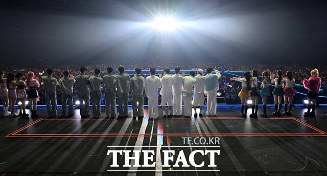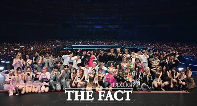 <더팩트> 가 주최하고 팬앤스타와 필링바이브(FEELINGVIVE)가 주관하는 '2024 더팩트 뮤직 어워즈(2024 THE FACT MUSIC AWARDS, TMA)'가 7일 오후 일본 오사카 '교세라 돔 오사카'에서 열린 가운데 출연 아티스트들이 관객들과 함께 기념 촬영하고 있다. 더팩트>