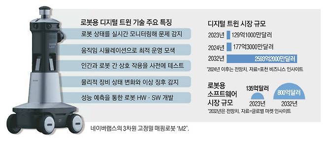 로봇 산업에서 디지털 트윈 기술이 속속 도입되고 있다. 디지털 트윈은 가상 공간에서 실물과 똑같은 일종의 쌍둥이 물체를 만들어 다양한 시뮬레이션을 통해 사전 검증하는 기술을 가리킨다. 그동안 디지털 트윈은 주로 제조·항공 산업에 적용됐는데, 최근 로봇 산업으로 적용 범위가 넓어지고 있다. 8일 정보기술(IT) 업계에 따르면 네이버와 엔비디아는 로봇 학습을 위한 디지털 트윈 플랫폼을 구축하는 데 속도를 높이고 있다. 이 같은 디지털 트윈 플랫폼은 클라우드, 인공지능(AI), 로봇 기술을 총망라하는 것이 특징이다.