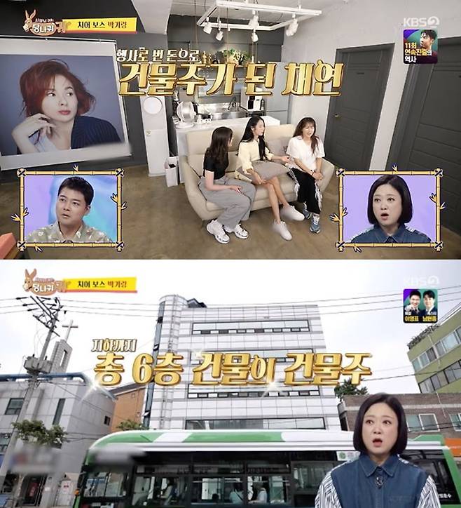 채연은 건물 가격에 대해 묻자 "그때보다 2배 좀 넘게 벌었다"며 처음 구매할 때 "2장 정도 (줬다)"고 말했다. 박기량이 억 단위를 짐작하자 "거기에 0 더 붙여 큰 거 두 장이었는데 2배 좀 올랐다"고 10년 전 자양동 건물을 20억에 매입했음을 밝혔다.