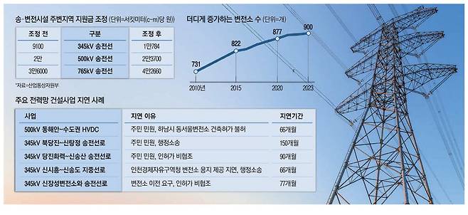한전은 10차 장기 송·변전발전설비계획에 따라 2036년까지 56조7000억원을 송전선·송전탑 설치에 투입할 계획이지만 곳곳에서 사업이 차질을 빚고 있다. 지역주민 반발과 지방자치단체의 비협조, 전자파 괴담 등이 결정적 이유다. 실제로 동해안~수도권 초고압직류송전(HVDC) 건설사업은 66개월 이상 지연됐다. 북당진~신탕정 송전선로 건설도 주민 민원으로 입지 선정이 늦어지고 있는 데다 당진시에서 공사중지 명령을 내리면서 소송전이 벌어져 150개월이나 지체됐다. 소송 결과 한전이 승소했다.