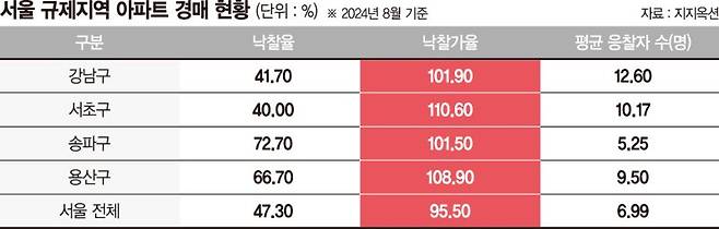 서울 내 투기과열지구로 묶인 강남3구(강남·서초·송파) 및 용산구 아파트 경매 낙찰가율이 모두 100%를 넘어섰다.
