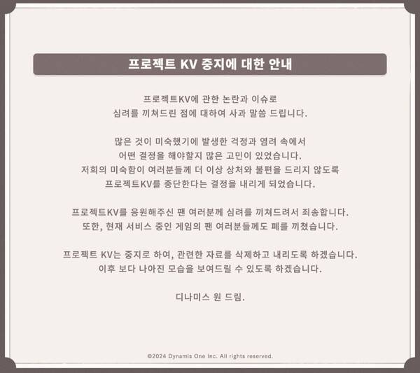 디나미스 원은 8일 공식 SNS로 "프로젝트 KV에 대한 논란과 이슈로 심려를 끼쳐드린 것에 사과드린다"며 프로젝트 KV의 개발 중단 소식을 알렸다.