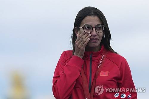 Morocco's Fatima Ezzahra El Idrissi reacts as she stands on the podium with her gold medal after winning the women's marathon T12 at the 2024 Paralympics, Sunday, Sept. 8, 2024, in Paris, France. (AP Photo/Thibault Camus)