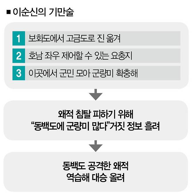 고금도에 머물면서 군량미를 확보하는 데 힘을 쏟은 이순신은 놀랍게도 '또다른 준비'를 했다. 왜적이 군량미를 확보하기 위해 고금도를 쳐들어오지 못하도록 했던 거다. 일종의 위장전술이었다.
