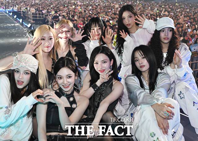 <더팩트> 가 주최하고 팬앤스타와 필링바이브(FEELINGVIVE)가 주관하는 '2024 더팩트 뮤직 어워즈(2024 THE FACT MUSIC AWARDS, TMA)'가 8일 오후 일본 오사카 '교세라 돔 오사카'에서 열린 가운데 에스파와 뉴진스가 관객들과 함께 기념 촬영하고 있다. 더팩트>