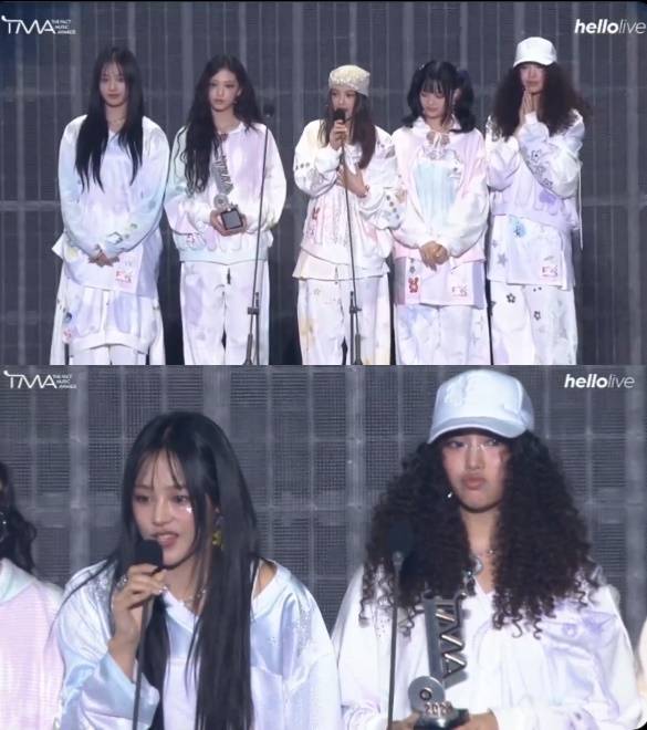 수상 후 팬들에게 감사 인사를 전한 뉴진스는 소감 말미 "우리를 항상 아껴주시고 지켜주시는 민희진 대표님 사랑하고 감사하다"고 말했다.