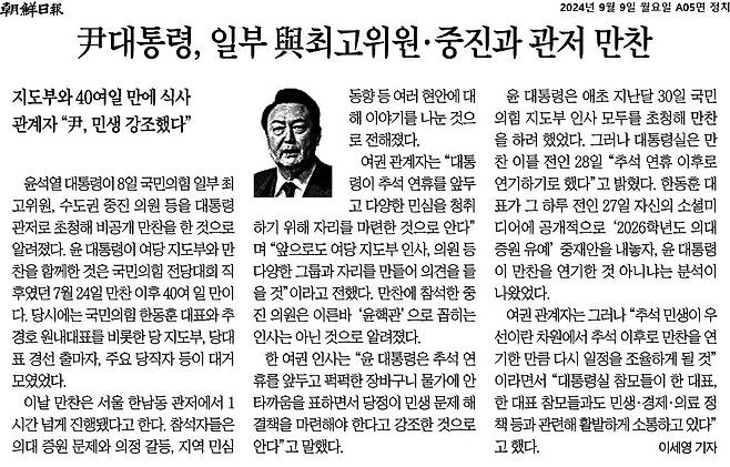 | ▲ 9월 9일 <조선일보>에 실린 '윤 대통령, 일부 여당 최고위원·중진과 관저 만찬' 보도. |
