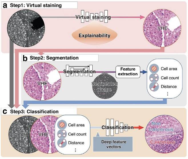 이어, 연구팀은 사람의 간암조직에서 얻은 PAH에 연구팀이 개발한 딥러닝 모델을 적용했다. 그 결과, ‘가상 염색’, ‘분할’, ‘분류’가 상호연결된 연구팀의 AI 모델은 간암세포와 정상 간세포를 98%의 높은 정확도로 분석했다.