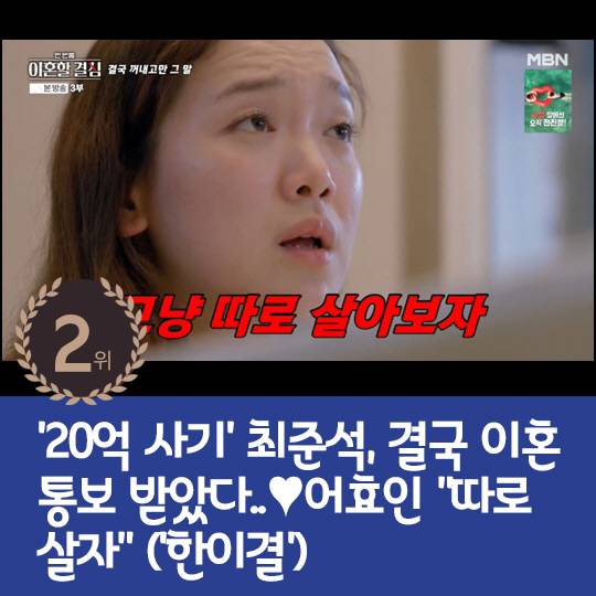 2위 : '20억 사기' 최준석, 결국 이혼 통보 받았다..♥어효인 "따로 살자"