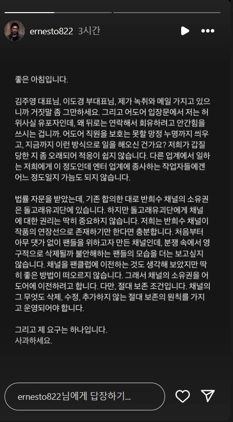 이와 함께 "만약 사과가 없으시다면 저는 반희수 채널을 팬들에게 이전할 수 있는 방법을 찾아보고 기존 합의에 대한 증거를 들고 어도어를 명예훼손으로 고소하겠습니다"라고 밝혔다.