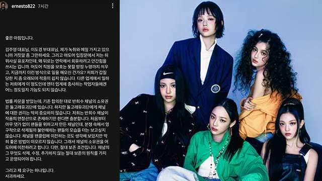 어도어는 이에 대해 공식 SNS를 통해 "뮤직비디오 제작 용역 계약에는 뮤직비디오는 물론 2차적 저작물에 대한 권리도 모두 어도어의 소유"라며 "어도어 승인 없이 뉴진스 IP(지식재산권)가 포함된 영상을 돌고래유괴단 채널에 게재하는 것은 명백한 계약 위반"이라고 반박했습니다.