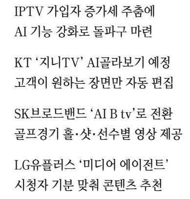 IPTV 3사가 일제히 집중하는 것은 AI 기능을 활용한 시청 경험 및 편의성 강화다. AI가 시청자에게 최적화된 콘텐츠를 추천해 콘텐츠를 찾아 헤매는 시청자의 피로감은 줄이고, AI로 자막을 생성하고 스포츠 영상의 하이라이트를 만들어주는 등 시청 편의는 개선하는 방향이다.